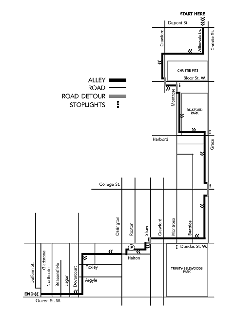 Step Into The Alley : : : : : : : There is something unique and revealing about alleys. We meticulously manicure front lawns and keep our porch patios spotless. But journey to the back alleys, and you discover what's behind the façade, like seeing your partner in the morning for the first time. Alleys are always portrayed as a place of ill repute, where muggers lurk, hookers do their tricks and rats rule the day. But a real-life inspection of Toronto's alleyways reveals a fantastic network that brings together neighbours, offers cyclists an opportunity to avoid the city's heavy traffic, and acts as Toronto's largest art gallery. The Spacing staff challenged itself to find extensive routes of inter-connected alleys. We wanted an escape route from the road, as if the cars were gangsters chasing us through the innards of the city. The only rule was an alley exit could be no further than a quarter of a block to the next alley entrance. The longest stretch we found was a 4.5-kilometre route, starting at Christie and Dupont and ending at Queen and Dufferin (it's downhill most of the way). The start and end of most alleys in Toronto is usually determined by railroad lines, which is exactly what stopped us from going any further north at Dupont or west at Dufferin. Using this route, travelling on the road to another alley entrance is needed on only five occasions (see map, below). There are tricky areas such as south of Bloor at Montrose: at this point, take the bike path that leads you into Bickford Park. We suggest cutting across the grass at the south end of the park until you can enter the alley on the south side of Harbord. Be careful at Shaw and Dundas: the entrance to the alley on the south side of Dundas is not easy to see beside the auto repair shop. Inhale the warm smells of the bakery near Dovercourt, check out the giant raccoon painted on a garage side at Crawford, just north of Christie Pits. You can discover more about your community when you see what your neighbours are hiding out back. |