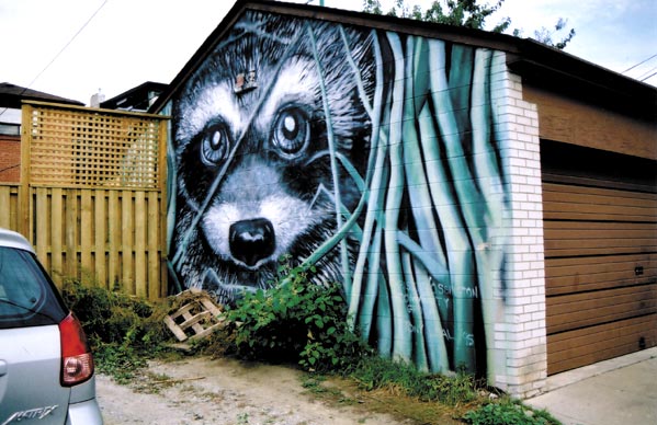 Step Into The Alley : : : : : : : There is something unique and revealing about alleys. We meticulously manicure front lawns and keep our porch patios spotless. But journey to the back alleys, and you discover what's behind the façade, like seeing your partner in the morning for the first time. Alleys are always portrayed as a place of ill repute, where muggers lurk, hookers do their tricks and rats rule the day. But a real-life inspection of Toronto's alleyways reveals a fantastic network that brings together neighbours, offers cyclists an opportunity to avoid the city's heavy traffic, and acts as Toronto's largest art gallery. The Spacing staff challenged itself to find extensive routes of inter-connected alleys. We wanted an escape route from the road, as if the cars were gangsters chasing us through the innards of the city. The only rule was an alley exit could be no further than a quarter of a block to the next alley entrance. The longest stretch we found was a 4.5-kilometre route, starting at Christie and Dupont and ending at Queen and Dufferin (it's downhill most of the way). The start and end of most alleys in Toronto is usually determined by railroad lines, which is exactly what stopped us from going any further north at Dupont or west at Dufferin. Using this route, travelling on the road to another alley entrance is needed on only five occasions (see map, below). There are tricky areas such as south of Bloor at Montrose: at this point, take the bike path that leads you into Bickford Park. We suggest cutting across the grass at the south end of the park until you can enter the alley on the south side of Harbord. Be careful at Shaw and Dundas: the entrance to the alley on the south side of Dundas is not easy to see beside the auto repair shop. Inhale the warm smells of the bakery near Dovercourt, check out the giant raccoon painted on a garage side at Crawford, just north of Christie Pits. You can discover more about your community when you see what your neighbours are hiding out back. |