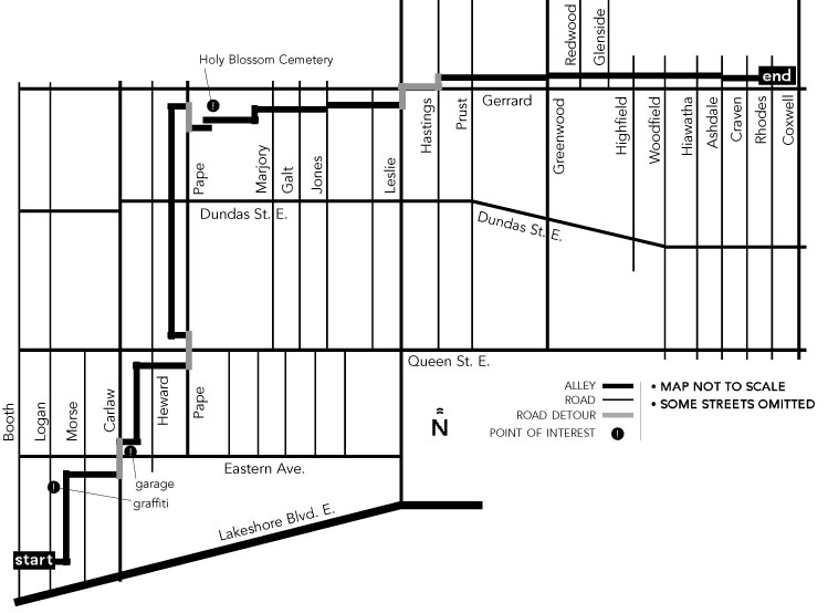 East End Laneway Getaway : : : : : : : Laneways are fascinating because of their variety of character. Some make you feel like you're not in central Toronto at all. One laneway, for example, with rows of cookie-cutter garages, seems quite suburban. Another alley, bordering an unfenced lot with long grass hiding rusted cars, is like a country back road. An odd jog where narrow alleys meet amidst brick buildings feels like a time before cars. This east end laneway excursion has a refreshing dose of this kind of variety. Starting near the bike lanes along Lakeshore Boulevard, the route travels 2.5 kilometres north and east and ends near Leslie and Gerrard. Compared to west end laneways, the connectivity isn't as good in the east. You can go a kilometre further, almost to Coxwell, by cheating a bit and using the streets to get to the laneway north of Gerrard that starts at Hastings. The start is easy to miss, at Logan just south of Eastern Avenue, because it's between two Purolator warehouse buildings. You feel like you're trespassing, especially with the cameras on the roofs eyeing you; but once you turn the corner, you pass a playground and you're on your way to feeling less delinquent. From Carlaw, the route cuts in and goes behind a garage. In late summer, trees along the alley here grow thick and jungle-like, crowding your passage. Turning the corner, you eventually come to an amazing collection of graffiti, including grimacing creatures and ghostly forms, all done by the same artist. You stumble upon these galleries here and there behind the streets, their sudden appearance contrasting with the general visual calmness of alleys. North of Queen Street, the laneway is fairly typical and passes behind fenced-off backyards. The route crosses Dundas and runs along an uninspiring townhouse development. At Pape, it travels in front of, and then alongside, the Holy Blossom Cemetery via a particularly narrow alley. From here, you pass another playground and then, until you reach Leslie, the alleys run behind businesses on Gerrard. By the time you reach the end of this excursion, you may notice how the hectic aspect of the city is further away. Traffic sounds fade to the periphery, allowing you to hear the subtler sounds of chirping birds and creaking trees. Occasionally you'll see a car, some kids playing or people walking their dogs, but for the most part laneways are tranquil. Emerging out onto the main streets after arriving via a route so estranged from the city, you see familiar neighbourhoods anew. visit Graeme Parry's website on Toronto laneways |