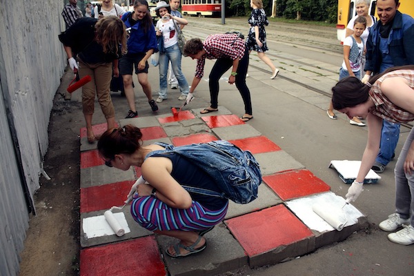Partizaning, an urban art-based activist collective, has been conducting public workshops in Moscow’s sleeping districts to address livability concerns in these neighbourhoods. The sleeping districts are planned communities of mass housing blocks on the periphery of the city. The workshop series, titled”КООП: Cooperative Urbanism,” used a variety of creative research-based approaches to engage citizens (such as the tram stop turned checkerboard pictured above). (Polis)
