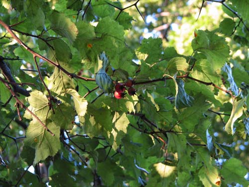 Down on all fours, my eyes adjusting to the darkness of this thicket, I could just make out the trunk — not touch it, mind you, but at least see it. I estimate that it’s a metre around, meaning that the tree is roughly 100 years old and predates the housing development of this area by a longshot. Hawthorns (Craetagus sp., aubépine) grow slowly and live long and this one I’d say is a leftover from CSL’s farming era — a scant 60 years ago — or may even have been seeded by a bird or squirrel. Hawthorns are a common pioneer species in old fields. On farms, they are appreciated for their beautiful white blossoms in sparing, similar to that of its cousin, the apple, also in the rose family (5 petals, 5 sepals – the green rigid structure supporting the flower). The fruit was also appreciated as is and used in jellies and fruit leathers.