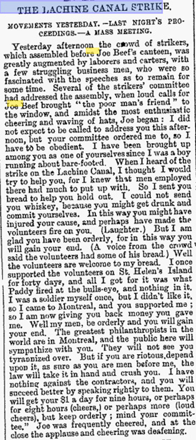 Joe Beef’s speech to the Lachine Canal strikers was recorded in the Montreal Witness, December 21st 1877.