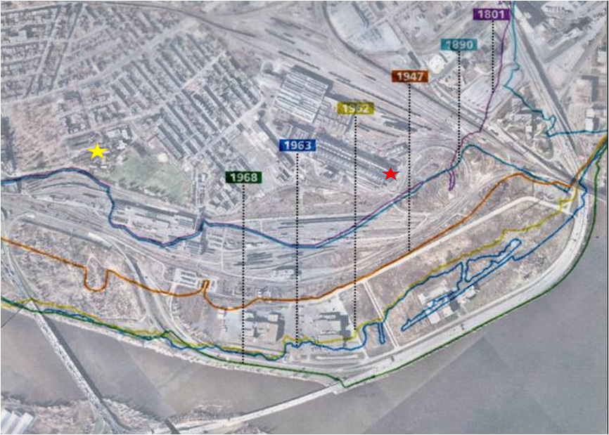 I added the two stars above as reference points: the yellow star is the Maison Saint-Gabriel and the red star is the entrance to the CN shop, built in 1929. When they were built, both landmarks were on the water’s edge. Today, they are more than 500 metres from the riverbank.