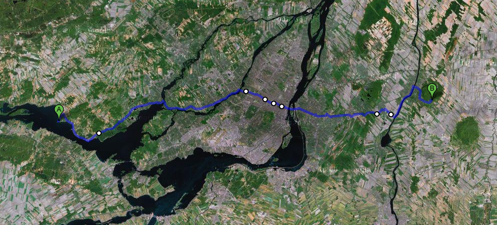 I would like to propose a three-day expedition on June 24-25-26 (long weekend) over a distance of approximately 100 km. One possible route could be the one illustrated in the map above (from Pointe-aux-anglais, west of Oka, to the summit of Mont-Hilaire) and linked here – but that is just an idea.