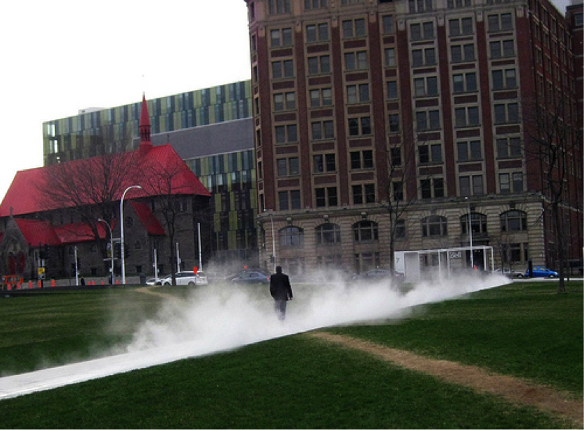 J’ai peur que dans une année ou deux, la traversée de brume ne soit plus fonctionnelle. La Ville a tendance a oublié complètement ses installations une fois qu’elles sont construites, et les effets semblables dans la Place Jean-Paul-Riopelle ne fonctionnent pas la moitié du temps…