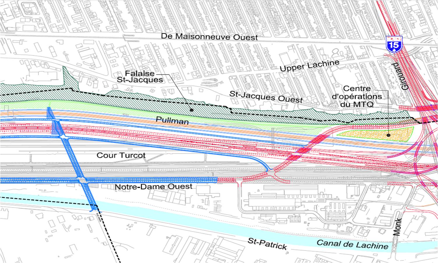 The MTQ’s plan for the Turcot Yards: Four CN tracks (two primary, two secondary) are indicated blue and orange under ‘Pullman’