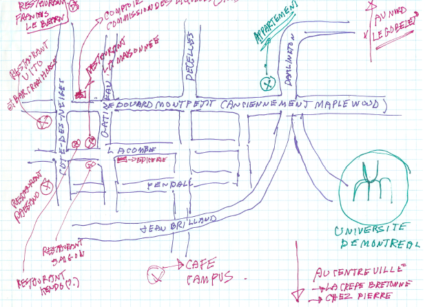 En 1964, mon père déménage seul à Montréal pour entreprendre des études universitaires à l’UdM. Il habite sur Maplewood (devenue Édouard-Montpetit) et mange, durant les premiers mois, autour de chez lui.  Il partage alors un appartement avec 3 autres étudiants et comme ses parents tenaient un restaurant c’est lui qui est désigné « cuisinier-en-résidence ».   À cette époque, on mange à Côte-des-neiges principalement de l’italien, du français… et de la « cuisine canadienne » à la Maisonnée (voir carte mentale dessinée par mon père). Le souvenir du restaurant Vito (doublé du bar Crazy Horse) est particulièrement marquant, comme celui de La crêpe bretonne sur la rue de la Montagne au centre-ville (où de nombreux étudiants venaient, apparemment, s’abreuver de cidre).