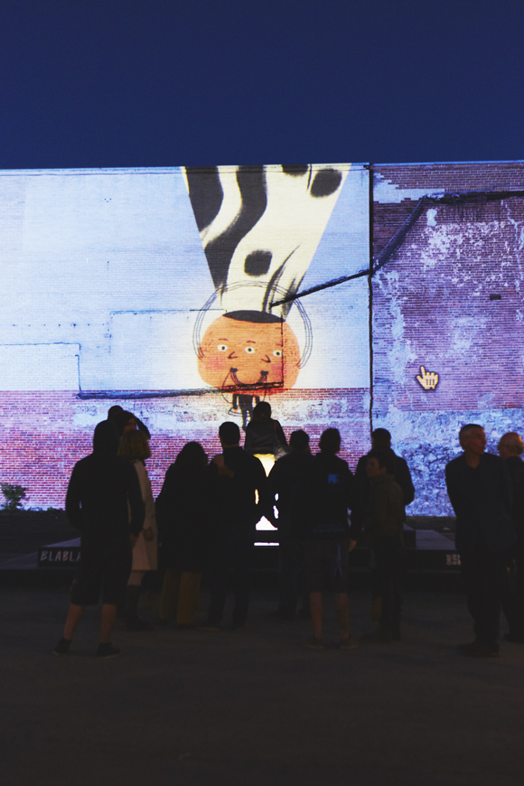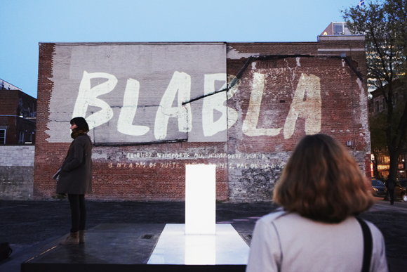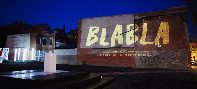 The installation was designed specifically for the space outside the Saint-Laurent metro station and is based on Vincent Morisset’s original online project Bla Bla, a film for computer. The seemingly simple interactive tale offers a new look at how humans communicate and reflects on the challenge of telling stories in the digital age. I highly encourage you to drop by any night between the hours of 9 pm and 2 am and experience the magic for yourself.