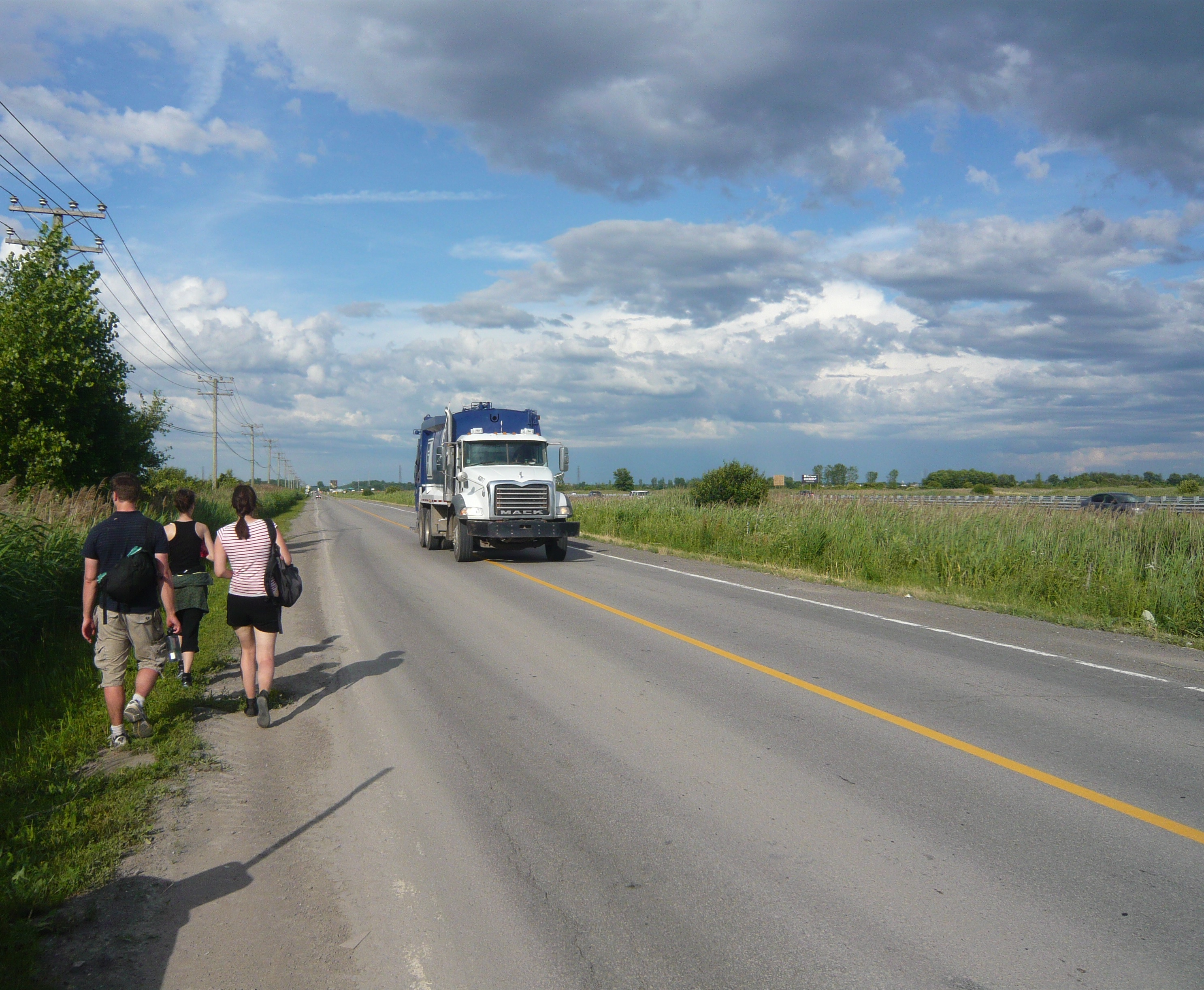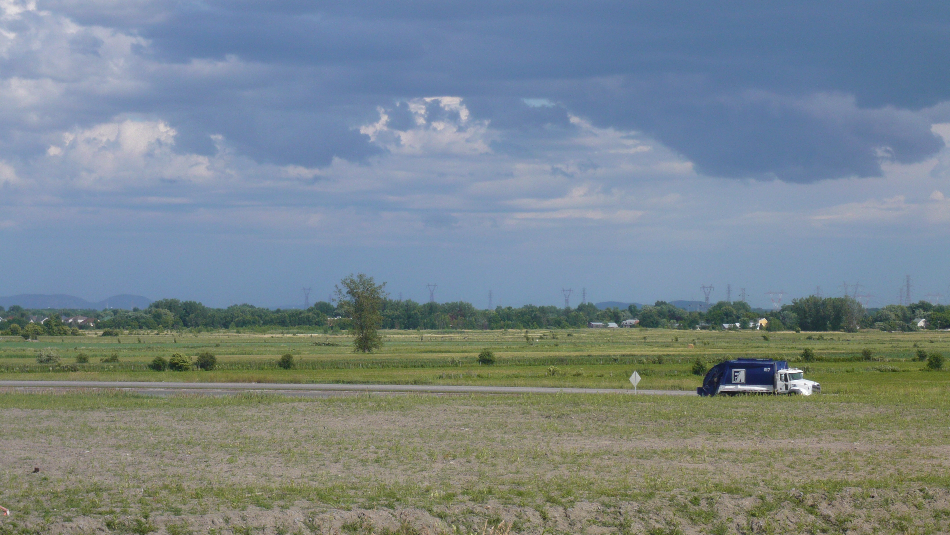 Deuxièmement, nous avons constaté que le centre de Montréal est visible de loin – en fait, nous n’avons presque jamais perdu le Mont-Royal de vue, aussi étrange cela puisse-t-il paraître. Que ce soit au beau milieu des champs de fraises, sur le Montée St-François à Laval, sur le bord de la voie maritime du St-Laurent à Ste-Catherine ou à partir de la route qui longe le site d’enfouissement de Lachenaie, Montréal et le Mont-Royal se révélaient souvent à nous, à l’horizon, au détour d’un regard. Chose étonnante pour le Montréalais que je suis: on voyait très clairement, en marchant sur la Montée Dumais à Lachenaie près de la 640, les Mont St-Hilaire et St-Bruno, qui se trouvent pourtant sur l’autre rive (voir photo ci-dessous).