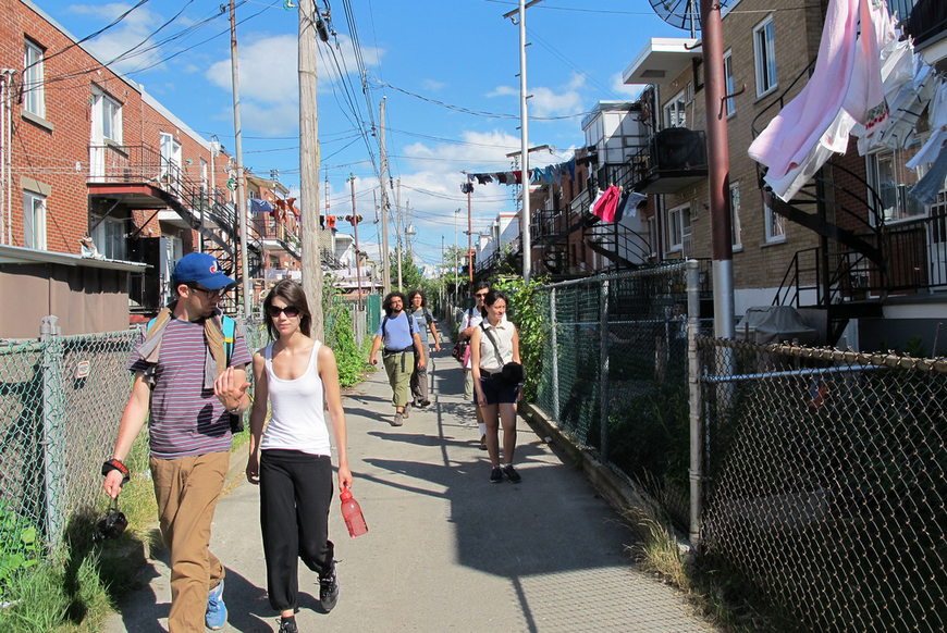 Tout d’abord, si j’avais pu moi-même régler chaque petit détail de l’événement pour maximiser l’émerveillement, la découverte et le dialogue, je n’aurais pas pu faire mieux: de la traversée du village de Kahnawake jusqu’à notre traversée des champs de fraises de Laval, en passant par les longues ruelles du quartier St-Michel et les nombreux lieux disparates qui parsèment Montréal-Nord, nous avons littéralement “vécu” chaque contraste, chaque détour, chaque endroit incongru et avons pu échanger sur ce qu’est la région ou sur ce que Montréal représente – entre nous, mais aussi avec les personnes qui se trouvaient sur notre chemin ou qui sont venues à notre rencontre.