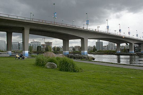 • In Vancouver, there is an effort afoot to make the impacts of climate change more visible. Artists Rhonda Weppler and Trevor Mahovsky have installed their piece, ‘A False Creek’, which shows projected changes in sea level over the coming years on the legs of the Cambie Street Bridge. The name is a pun which plays on the body of water (False Creek) and the level of change that the creek may experience in the years to come. (Pop Up City)