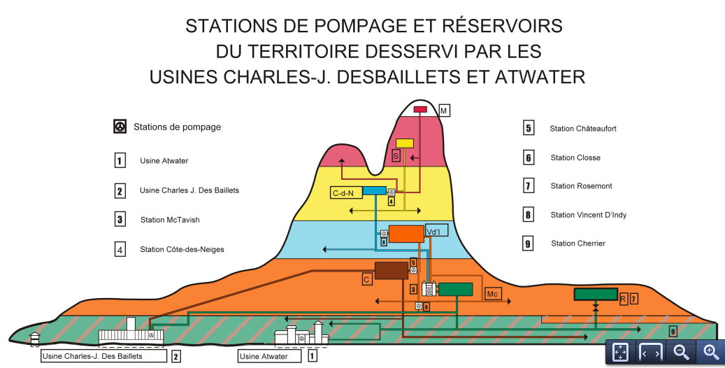 Ces deux symboles de Montréal, le fleuve et la montagne, sont intimement liés. Comme l’illustre l’image ci-dessus, le mont Royal est traversé par d’innombrables rivières artificielles et rempli de piscines secrètes qui permettent d’apporter l’eau aux quartiers surélevés. Les cinq réservoirs du mont Royal contiennent ensemble 104 piscines olympiques d’eau potable, adroitement camouflées sous le roc de la montagne — cinq bouts, en quelque sorte, du Saint-Laurent en exil sur le mont Royal.