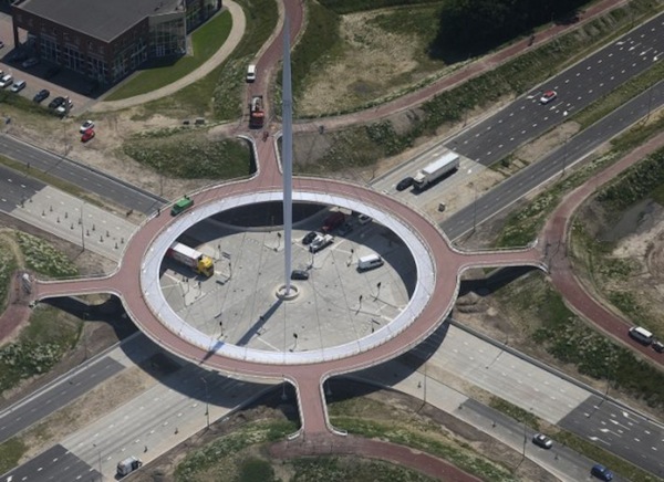 Another cycling innovation courtesy of the Dutch for you. This rural roundabout is the entrance to Eindhoven. While the original roundabout design had bike paths and traffic lights, the Dutch deemed it not quite safe enough. Thus, in early 2012, construction began on the floating bicycle roundabout – a suspended piece of cycling infrastructure that completely separates bikes from cars. (Don’t be alarmed by the cars on the cycling path – this photo was taken during construction). (Bicycle Dutch)