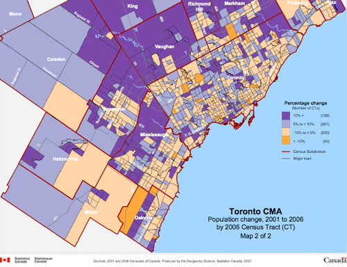 Although the overall growth rate for the city of Toronto may have been less than 1%, if you take a closer look within the city itself, there are definite high-growth hotspots, as the following Statistics Canada PDF map (a verson of which is also in today’s Toronto print edition of The Globe and Mail) shows: