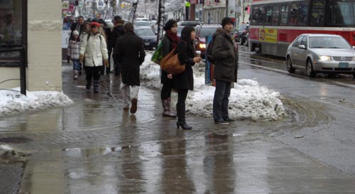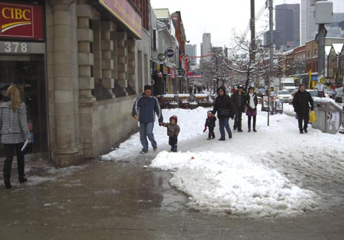 Finally, of course, there’s the problem of people not clearing snow from the sidewalk in front of their property. I think that more sidewalks, at least on major roads, should be ploughed by the city, but in the absence of city ploughing, it’s a law that needs to be enforced. Here, for example, is the sidewalk outside the CIBC bank at Queen and Spadina.