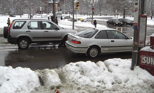 – the road ploughs leave huge piles of snow at intersections and transit stops, which pedestrians then have to climb over;