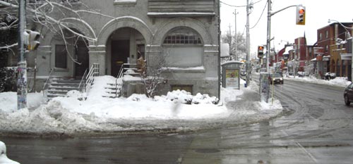 The bank has cleared and salted the snow in front of the entrance, but the wide sidewalk along Queen — which sees some of the heaviest pedestrian traffic in the city — has been left unshovelled, becoming packed down and slippery. I know CIBC has suffered a drop in profits this year, but I’m sure in their multi-billion dollar budget they could find a few hundred dollars to hire someone to clear their full sidewalk even on days they’re not open, so that they are in compliance with local bylaws. Surely it’s worth their while just to avoid the danger of getting sued?