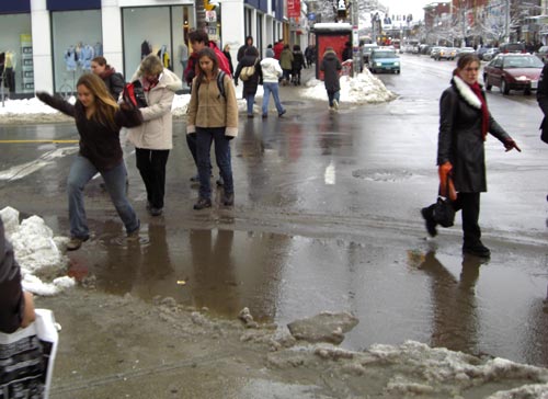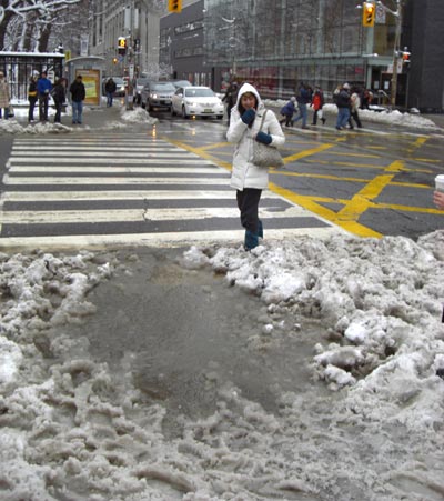 – when the snow starts melting, large pools of salty water that are difficult to cross accumulate at intersections because sewer grates are left blocked with snow; and
