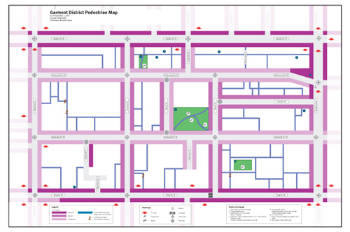 The exercise reminded me of a project I undertook a year and a half ago, in September 2007. I wanted to explore the way walking is such an intensive use of space (compared to the extensive nature of driving — cycling fall somewhere between), and generates that intensive experience and knowledge that I later saw in the youth of St. Jamestown. So I mapped out my own little neighbourhood, the Garment District (Spadina to Bathurst, Queen to King) as a walking space, and my friend Michael Pereira turned it into an attractive graphic map (click here for a PDF version of Garment District Pedestrian Map — you can zoom in to 200% to see details).