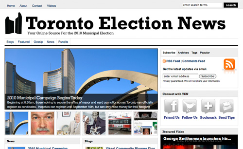 Just launched Monday, Toronto election news clearinghouse Toronto Election News is a splashy aggregator that aims to be the most comprehensive source of information on the titular topic. When it comes to offering information about itself, however, TEN is a bit more coy.