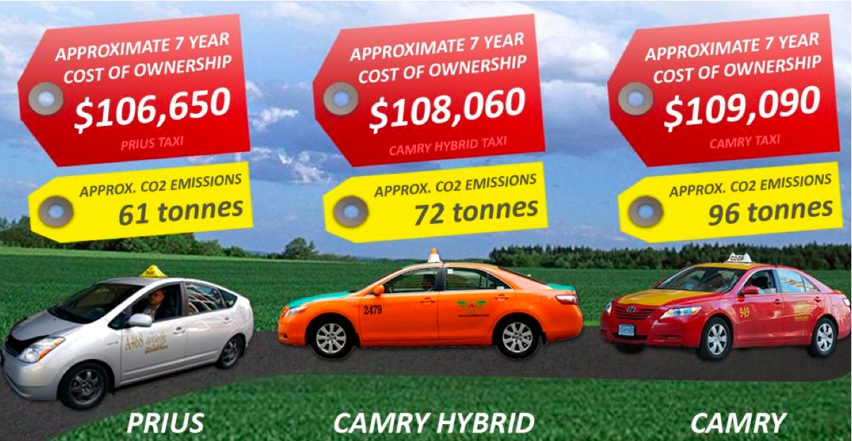 A 2009 study published by the Toronto Atmospheric Fund, TAF, reported Toronto’s taxi fleet CO2 emissions could be cut by 25 percent, up to 19,000 tonnes per year, if all cabs went hybrid. The study compared conventional gas-powered Toyota Camry taxis with hybrid Camry taxis, collecting 750,000 km of fuel consumption data over 18 months, and found that drivers could save roughly a thousand dollars over the seven-year allowable taxi lifespan. While the savings are modest, the emission reduction benefit is substantial. Hybrid taxis emit an average of three tonnes less CO2 per year than conventional cabs.