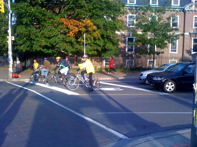 I like the new bike boxes but the are hardly the first. Toronto’s own Urban Repair Squad showed the way two years ago at the corner of Harbord and Bathurst with the first ever two bike boxes.