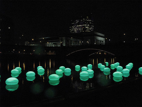 • Core77 chronicles a beautiful installation on Philadelphia’s Schuylkill River. 100 orbs of floating light changed colour in response to the activity of passers-by on shore. “The installation, designed by Howeler + Yoon Architecture, is enabled by RFID tags—when visitors sit on the landed orbs, the floating ones respond by changing the pattern of light spanning the river, without any physical tether between land and water.”