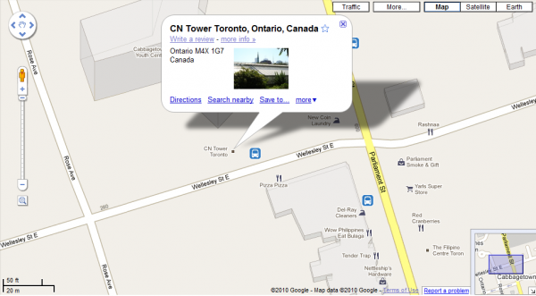 It seems that search engine superpower and go-to map company Google has had some problems arranging Toronto lately, with the city’s most iconic building and way-finding tool being inappropriately placed in Cabbagetown. Searchers can find the CN Tower listed twice, once in its actual location, and once more with the postal code M4X 1G7.