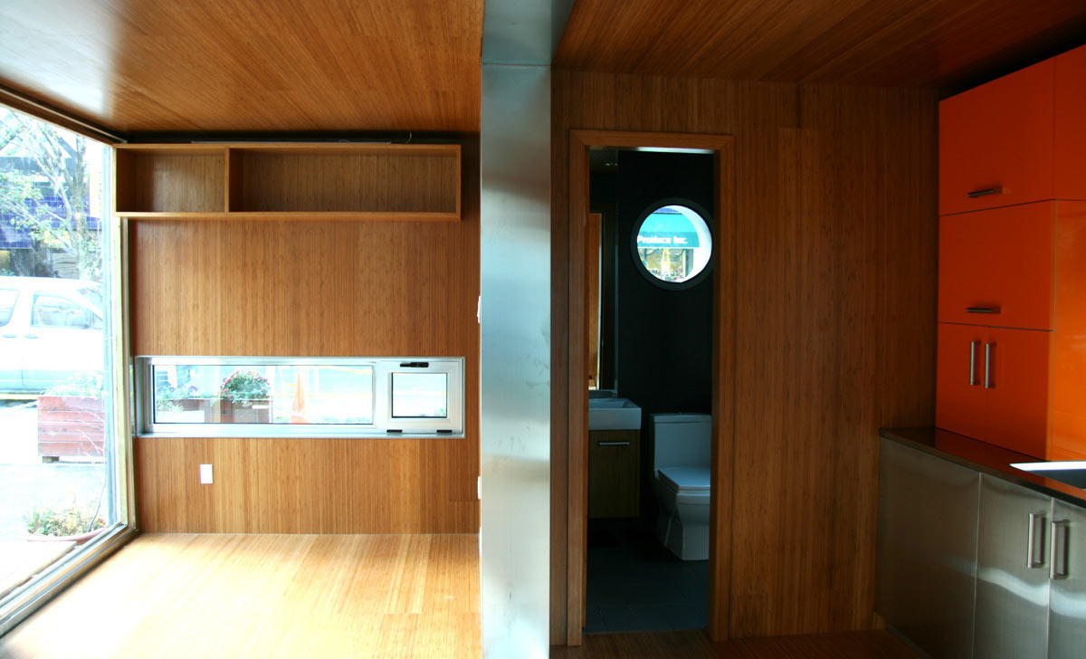 An entire 400-square-foot house can be built within a shipping container, and packed up to go on a freighter. On the site – anywhere that a truck and a crane can reach – clients connect the services, and away they go. (Assuming they’ve got planning permission and a foundation in place.)