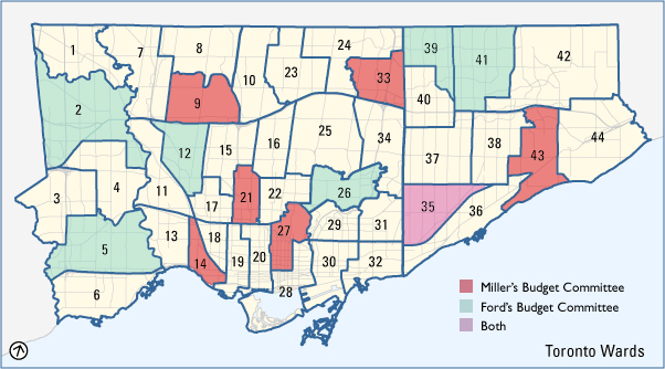 • The mayor is the chair of the Executive Committee, but of course does not himself represent a particular ward. That said, before being elected to the top office, Miller represented ward 13 (Parkdale–High Park) and Ford represented ward 2 (Etobicoke North).