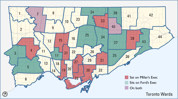 Not being a Torontonian (or even lived in Ontario), I can only look at the maps and the people who claim that Miller shut out the suburbs do have a point: The inner core of Toronto controls the lion’s share of the old Miller exec. However, that doesn’t excuse Ford’s behaviour, which is worse.