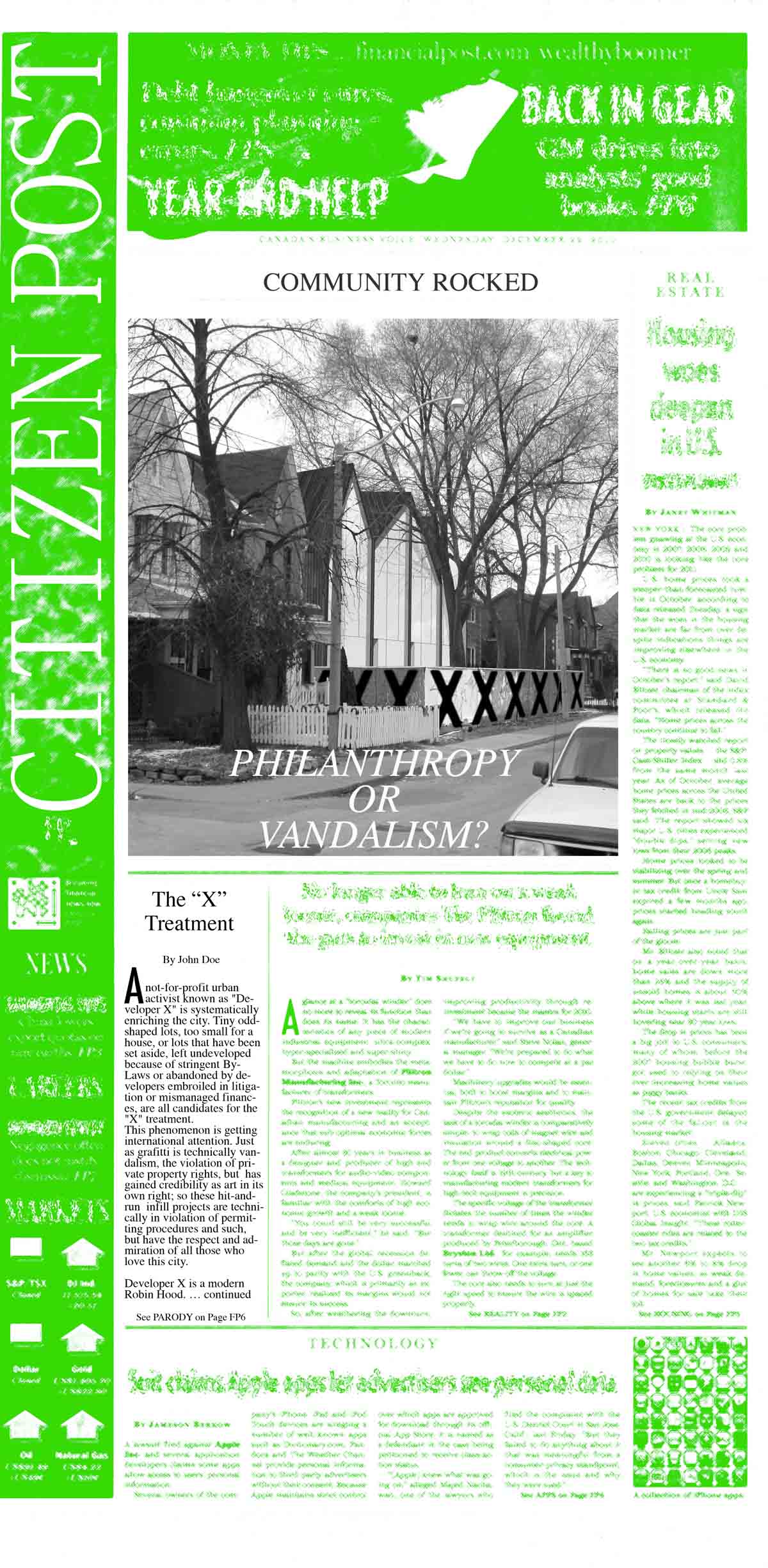 And most intriguing: Reigo and Bauer have imagined “a fictional philanthropic, vigilante development endeavor” that drops in prefab modern houses to fill up empty lots in the city. I like the gist of the designs they’re proposing – assertively modernist houses with pitched roofs and a familiar scale. And frankly, I can’t wait to learn more about this project to better our streets.