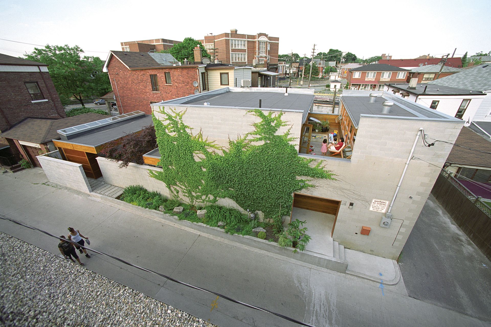 Drew Mandel’s office has drawn up a “typical residential Toronto streetscape” with five of their houses on it, highlighting their forms and “the interconnected spatial relationships that reach outside the boundaries of the building envelope and into the sites, the sky and to the landscapes beyond.” (I wrote about Mandel’s Ravine House here.)