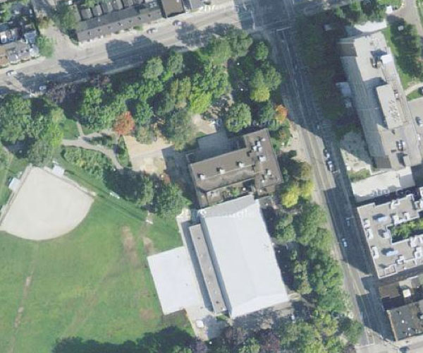 True to the popular vote, the ballpark shown is indeed Moss Park, at the corner of Shuter and Sherbourne St. Thanks for all of the guesses, and stay tuned for another Spacing Satellite poll next week!