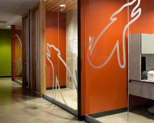 There are supergraphics printed on the glass office partitions (by Adams + Associates Design Consultants with 7th Generation Image Makers). All of this is intended to create, as project architect Danny Bartman told me, a “pan-aboriginal” feeling. “It was important to leave it open a bit, culturally,” he says, since the agency serves people with roots in many different first nations. NCFS Toronto’s executive director, Kenn Richard, says the effect is to make his clients much more comfortable than they would be in a more conventional office environement.