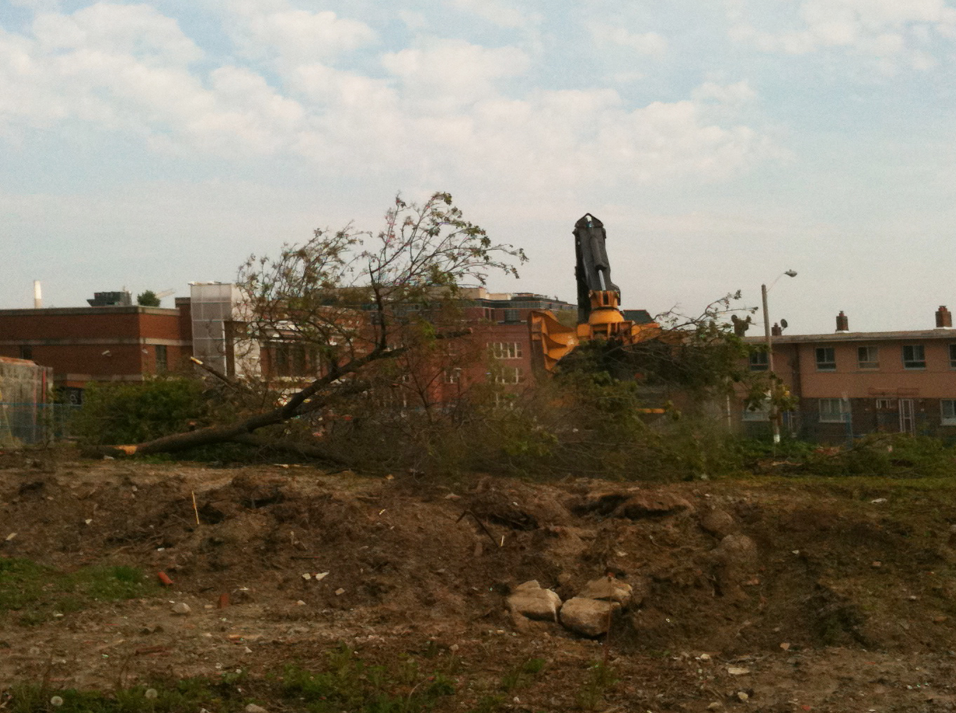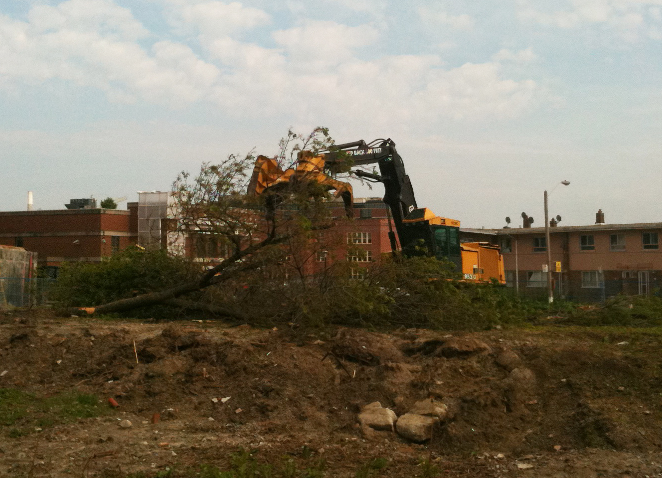 As Catherine Porter of the Star reported a couple weeks ago, trees are being cleared at Regent Park to make way for the next phase of re-development. Above is a short video of the feller buncher operator cutting up a green ash tree in a recently cleared lot on Dundas, taken Saturday May, 28th.