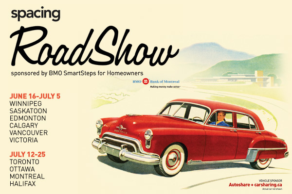 Events on the western swing will take place in Saskatoon (June 20th), Edmonton (June 22nd), Calgary (June 24th), Vancouver (June 28th), and Victoria (July 5th). The eastern swing starts in Toronto (July 12th), and heads to Ottawa (July 19th), Montreal (July 21st), and Halifax (July 25th).Check out the Spacing Road Show micro site for all the details of each event. You can also visit Spacing’s Facebook page to RSVP to the events in your city.