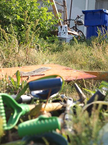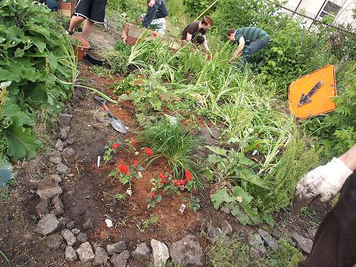 The ground is hard as concrete and the sun is baking hot, even at 6:30 in the evening. We all took to breaking ground. Taking pains to avoid the hardy burdock that we will keep in the new garden as well as the sunflowers that had been planted along the back fence a few weeks ago by one the guerrilla gardeners. Many hands make light work and after a while we start to see progress.