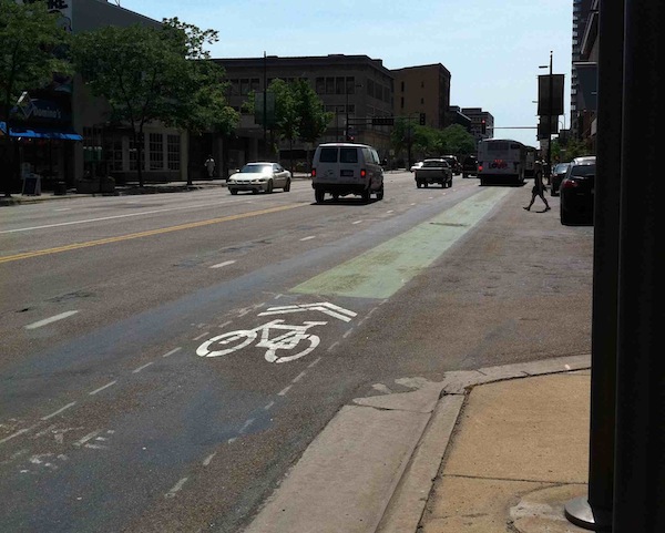 Greenways and lake routes are all well and good, but only if they connect to a good street system. According to the City’s bicycle website, Minneapolis has 46 miles (about 74 km) of on-street bicycle lanes, with more planned for the future. I actually encountered very few bicycle lanes in the city, but also found that the level of traffic on many of the roads I was travelling, including those located in the downtown core, was such that I didn’t feel squeezed out.