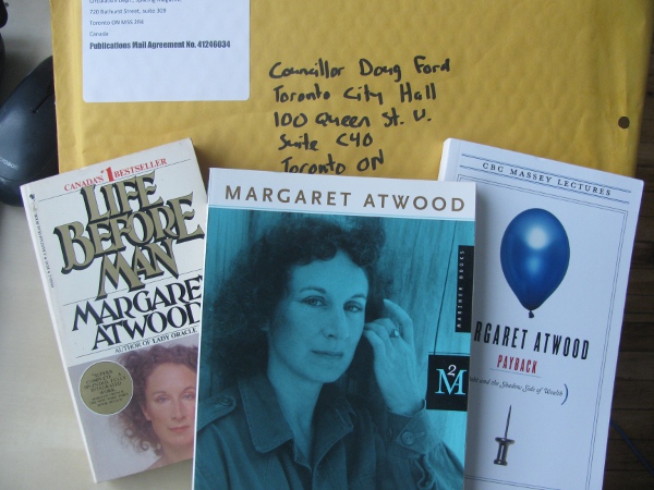 We urge you to reconsider your position regarding any reduction to the number or services of Toronto’s libraries. And, as huge fans of Ms. Atwood, we also encourage you to familiarize yourself with her writing. With tongue firmly planted in cheek, we’ve included a few of her works to add to your personal collection.