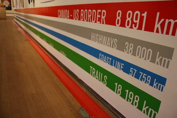The result is that the difference that size makes becomes apparent. Geography on a national scale begins to be experienced like, well, your own back yard (except more fun and in vivid technicolour). A visitor to the exhibit walks around, and after a bit, starts to internalize that the city and space all around them – the huge urban grid of Toronto – is literally as big as a foot’s print in this shrunken man-made country-place. To make it even more of an immersive spatial experience, DoUC represents measurements of length on the lower section of the gallery’s walls. Four parallel horizontal bars unfurl at the wall on the right hand side of the gallery entrance, simultaneously travelling the total scaled-down distance of the east and west “Coastline”, the nation’s “Trails”, “Highways”, and the “Canada-U.S.A. Border”. Highway and trail segments are labeled further by the total length contained within each province. It’s all like walking through a giant pop-up ‘resources’ page in an atlas, but with the bonus of getting to see historical, iconic and innovative design for the outdoors in this strangely abstract but physical environment.
