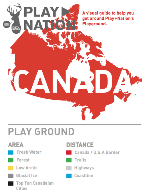DoUC created the “Play>Nation Playground” by working with scale and proportion, putting into practice the exhibition’s theme of physicality in order to trigger the deeper level of understanding that comes from a body’s experience of a space. The DoUC’s first step was to shrink Canada’s massive territory to fit the floor area of the 3rd floor DX gallery, running a bright red strip of vinyl around the edge of the gallery floor with ‘Canada 9 984 670 km2’ showing at intervals. DoUC then used more brightly coloured vinyl-strip rectangles to measure out the total percentages of Canada’s territory taken up by each of the country’s geographic outdoor play sites: “Fresh Water” (with sub-rectangles to show the total area of major lakes and of the Great Lakes), “Glacial Ice Cover” and “Main Land”, the ten biggest “Urban Areas”, “Low Arctic Tundra” and “Forest”. Each block of floor space is shown in true proportion to the size of the country itself, or the total area of the gallery floor.