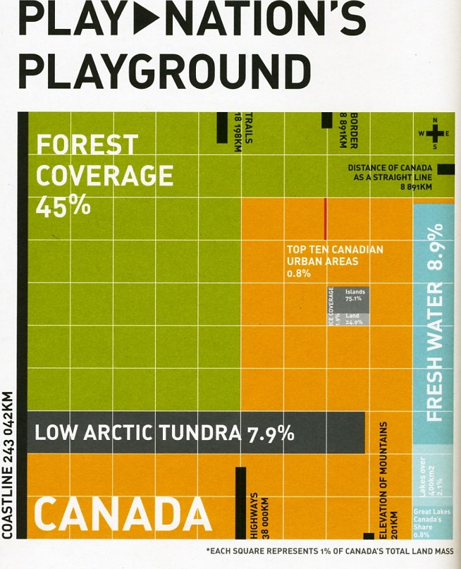 What if you could experience statistics and graphs spatially? I mean, really climb inside a well-made graphic chart and walk its clear proportions? It’s a question that Ms. Frizzle could have asked of the adventurous children of The Magic School Bus, and it’s a question that is explored with similar playfulness by the Department of Unusual Certainties (Brendan Cormier, Christopher Pandalfi and Simon Rabyniuk, currently Spacing Magazine contributors) in their first collaboration as innovators-in-residence at the Design Exchange. Play>Nation, the new exhibition on the 3rd Floor of the DX covers a great topic – exploring how geography is linked to the Canadian identity by playing with landscape, with history and with the symbols of Canadian outdoor culture. The Play>Nation curatorial team (Noa Bronstein, AnneMarie Minardi, Mark Scheibmayr and Katie Weber, with the DX Graphic Designer, Lisa Zych) is particularly interested in how it came to be that so many Canadian designers of outdoor recreation gear have attained world-class status. Chock full of iconic and innovative Canadian outdoors design, the items on display by themselves would be worth a look, but the DoUC’s contribution to the exhibition design makes the show a truly exciting place to take a spatial frolic.