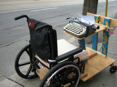 For those looking to get out into the fabric of the community, King has created the Nomadesk – a nomadic writer’s residency made out of a wheelchair and typewriter.
