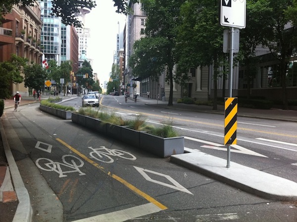 The lanes are also allowing more people to ride their bikes downtown than before. Not only have the numbers of cyclists on those streets risen (which could just be due to people changing their routes to use the lanes), but the number of women and children biking is also increasing [PDF]. On an anecdotal level, I spoke with two friends in Vancouver who were once too timid to ride downtown, but were now riding in the separated lanes. (Check out this video from Spacing Vancouver to see what the lanes look like in action.)