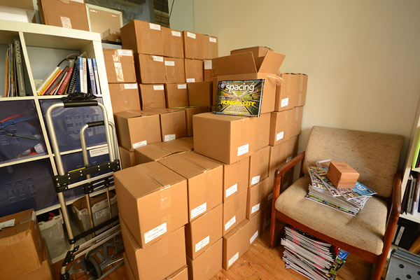 The new issue of Spacing — with an 18-page cover section focused on food in the city — will hit newsstands and your mailboxes next week. A whack of boxes arrived at our office today (see photo bel0w) while another shipment just got to our mailing house. If you subscribe to Spacing expect to see your issue by the end of next week (if you don’t subscribe, maybe you should reconsider). If you pick up a copy on newsstands expect the issue to roll into stores by the end of the week too.