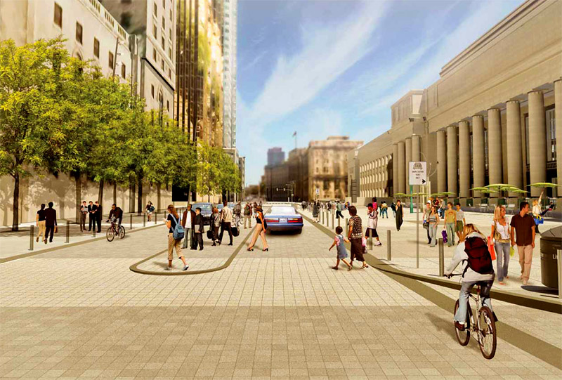 From a pedestrian point of view, the plan presented (PDF) is very exciting. Its primary purpose is to not only create a better, more pedestrian-oriented area for the very large number of pedestrians who enter and leave the station each day, but prepare it for an expected doubling of pedestrian activity over the next 10-15 years. The plan takes advantage of the fact that the area needs to be dug up for the Union Station project anyway, so just returning it to its previous, uninspiring state would still cost a lot of money — better to spend that money on a transformation.