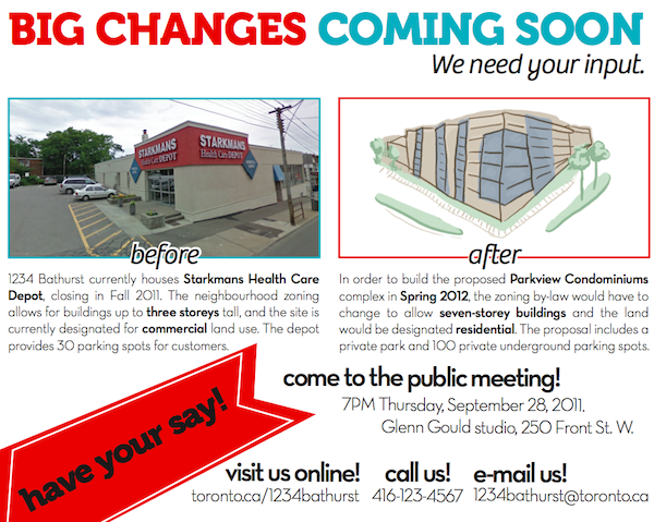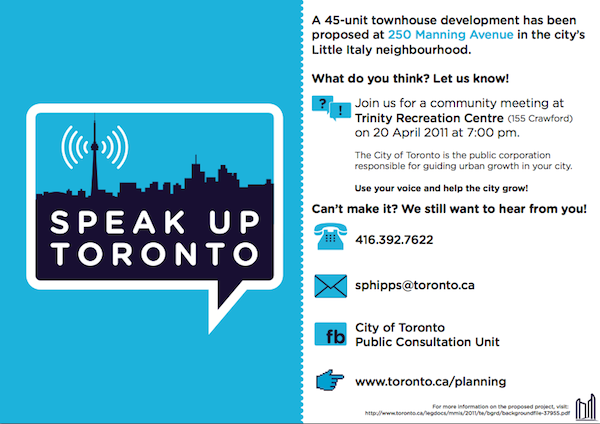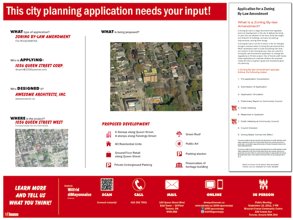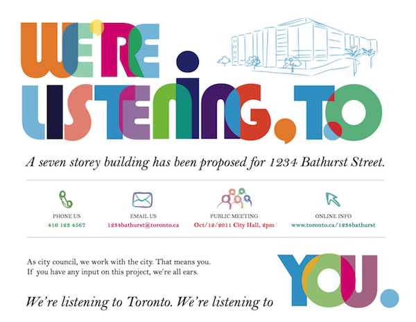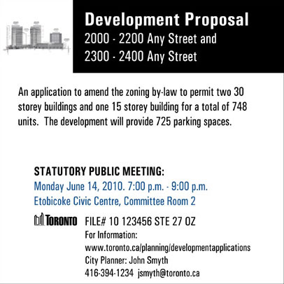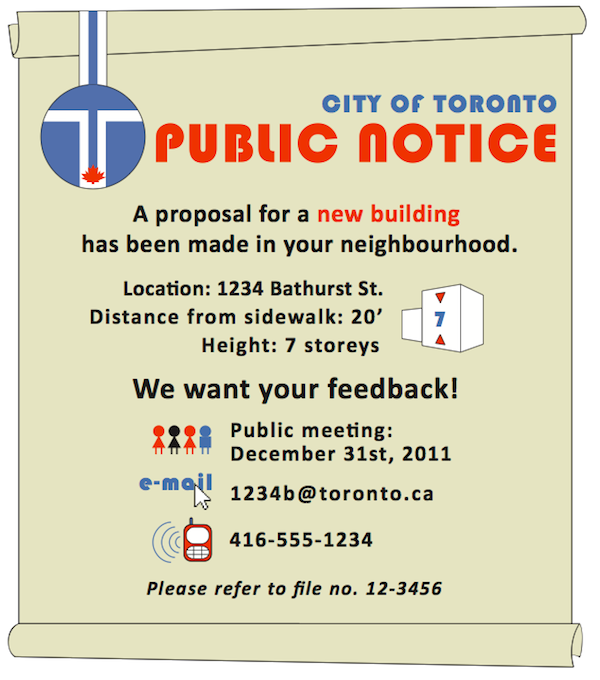 Planning application notices. They are so banal that you’d be forgiven for not noticing them as you move about town or flip through The Sun*. But these dull documents hold an important key to engaging Toronto’s citizens in helping to shape their communities.