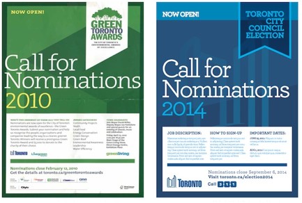 Indeed, outreach efforts to encourage nominations for the Green Toronto Awards are more extensive than for Mayor, Council or School Board positions. Borrowing from the Green Toronto Awards’ approach, this mock-up of a Call for Nominations poster for City Elections would be a step in the right direction.