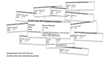 Vancouver’s Election website offers a useful example of a possible alternative. The site immediately connects you with candidate profiles, bios, contact information and nomination papers. In Toronto’s ward system, a function to connect with your candidates by entering your postal code would be a welcome addition. The City’s website should also include a map of campaign offices and a calendar of debates.